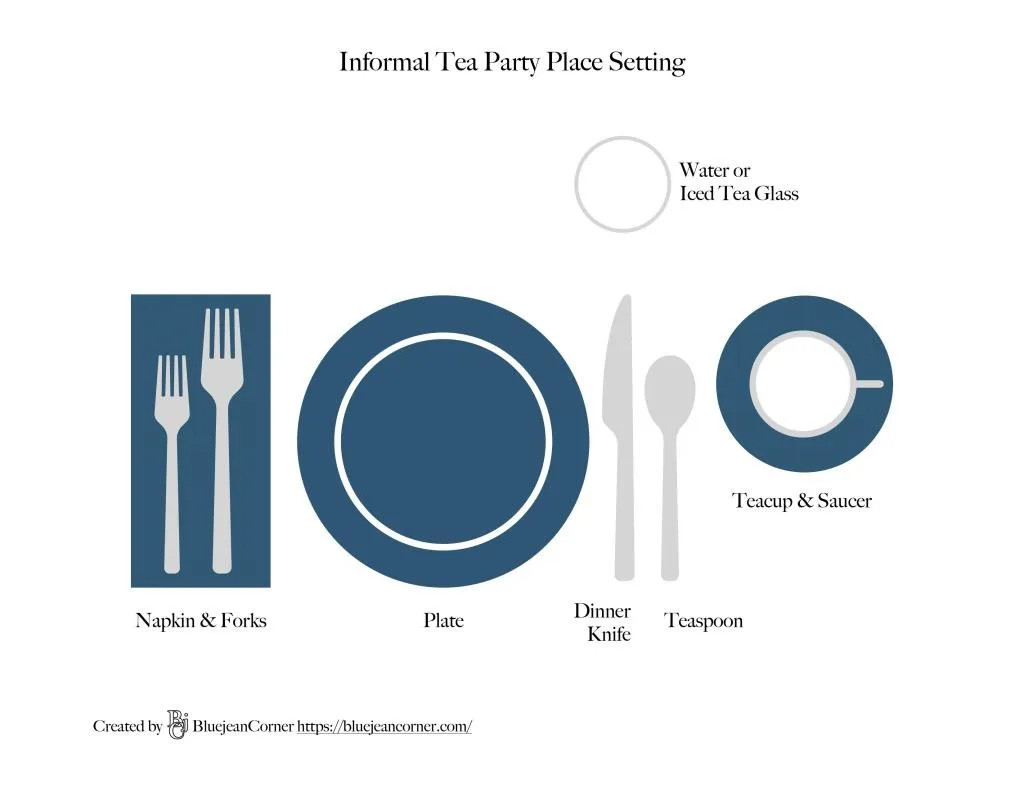 Penyediaan meja untuk hidangan tea time sangat simple sebenarnya. Sediakan satu atau dua pinggan makan kecil sahaja untuk setiap orang bergantung kepada jenis makanan yang dihidangkan. Letakkan sudu kecil di sebelah kanan pinggan untuk mengacau teh. Sekiranya anda menghidangkan kuih yang melekit atau makanan yang boleh menyebabkan berterabur, sediakan juga garfu kecil di sebelah kiri pinggan. Sediakan juga pisau yang diletakkan diantara pinggan dan sudu kecil dengan sisi tajam menghadap ke pinggan. Untuk cawannya pula, sediakan satu cawan dan piring diletakkan sekali yang disusun sebelah kanan sudu kecil.