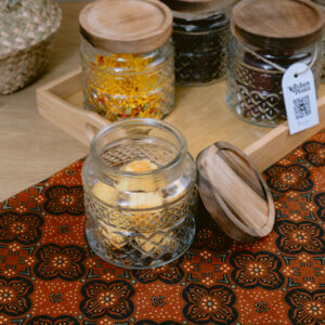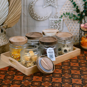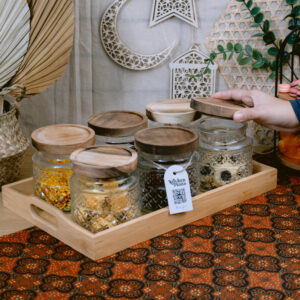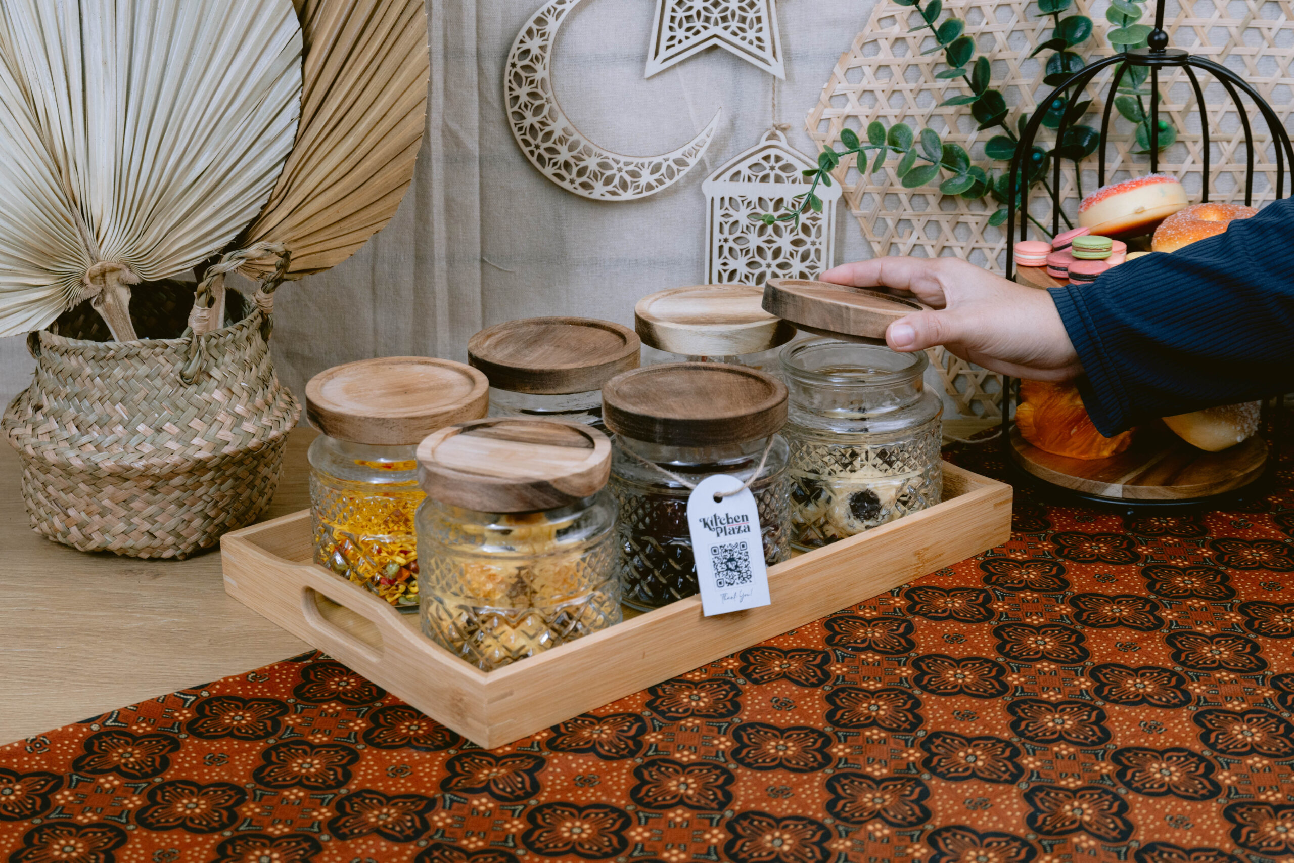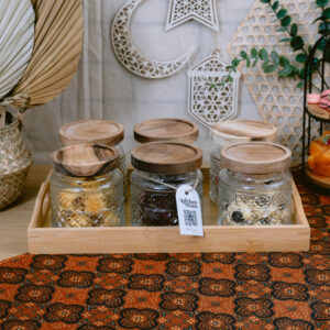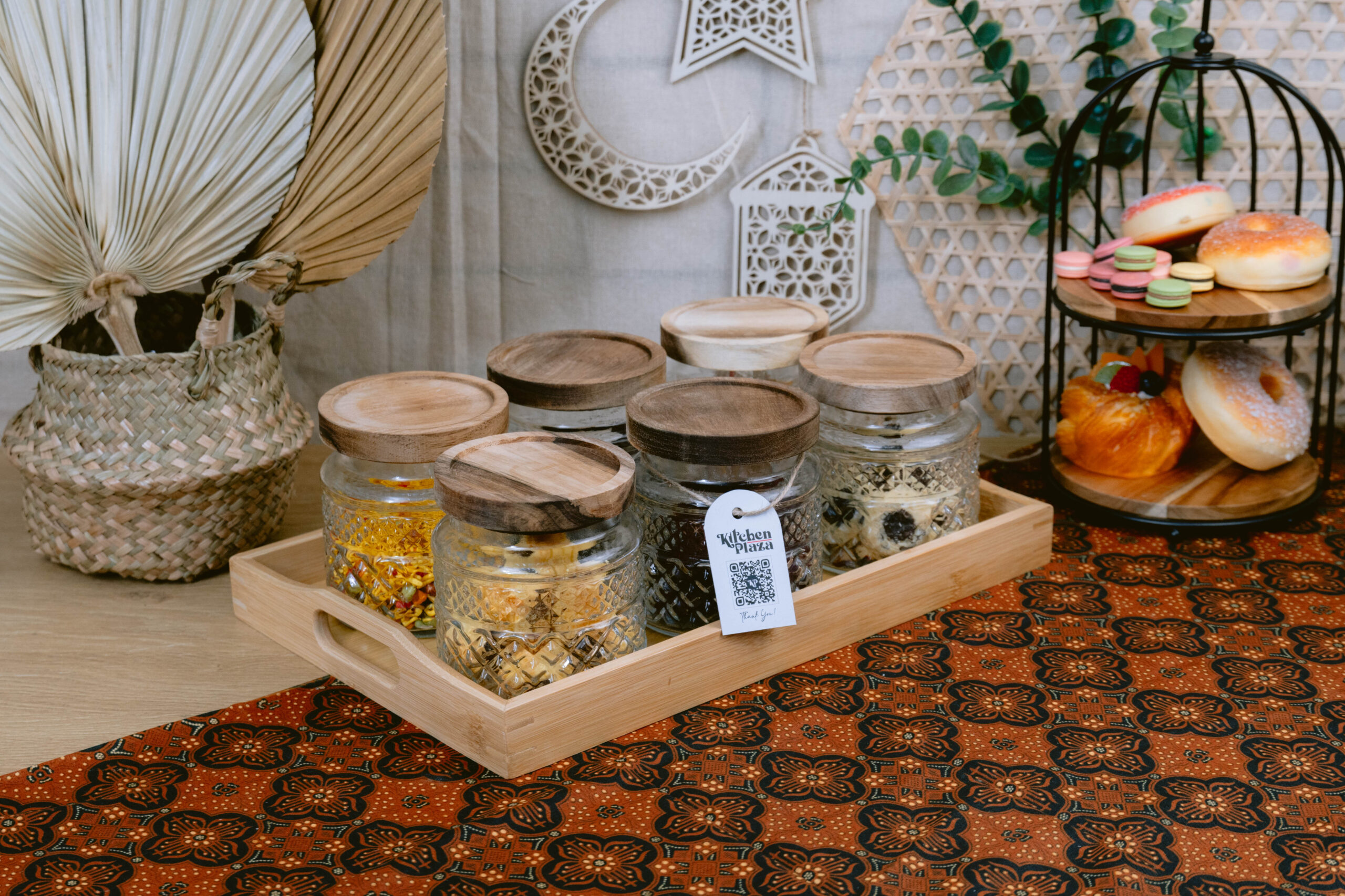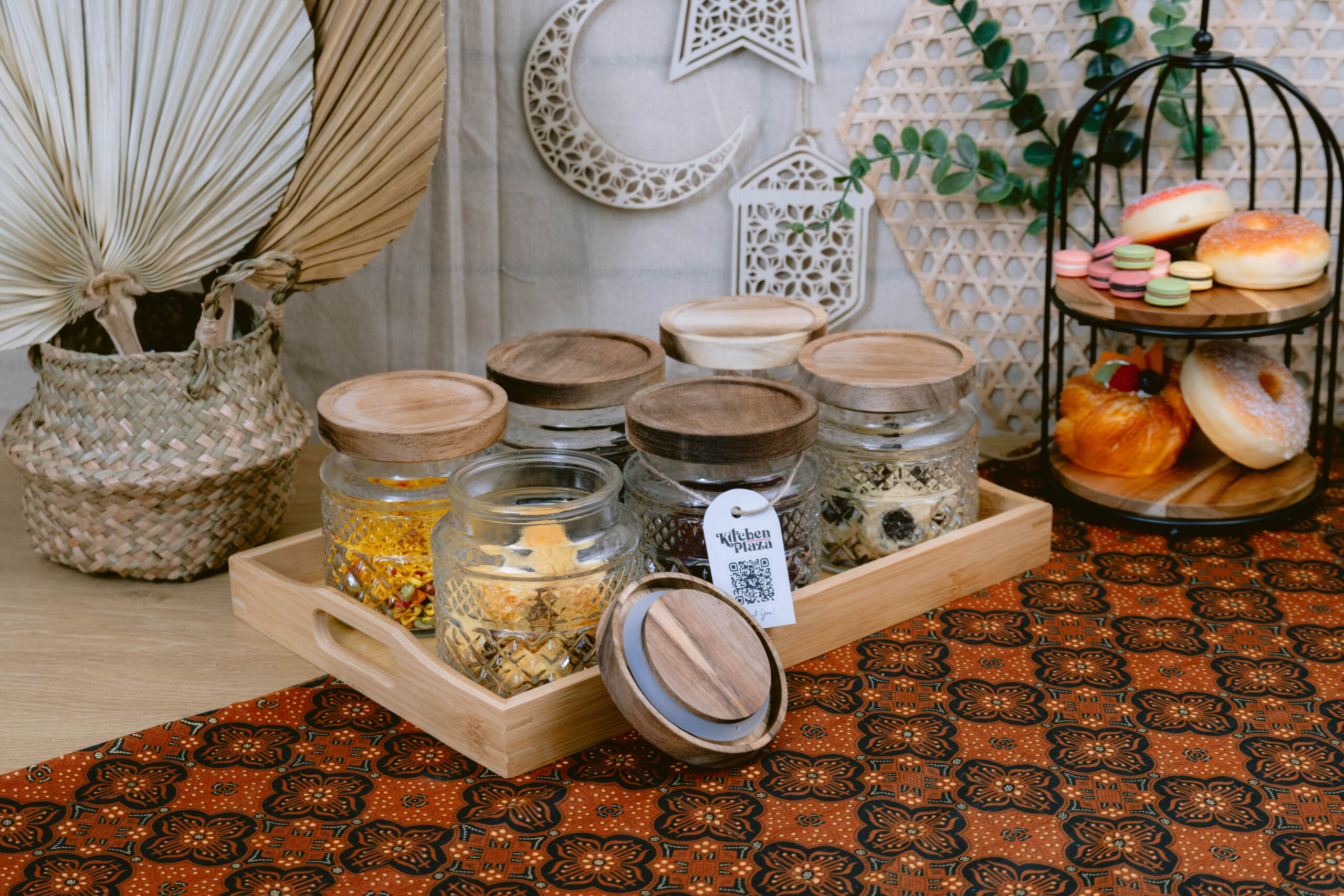 ✅ 6x Wooden Lid Jar (600ml setiap satu) – Ruang penyimpanan luas untuk kuih, rempah, atau biji kopi